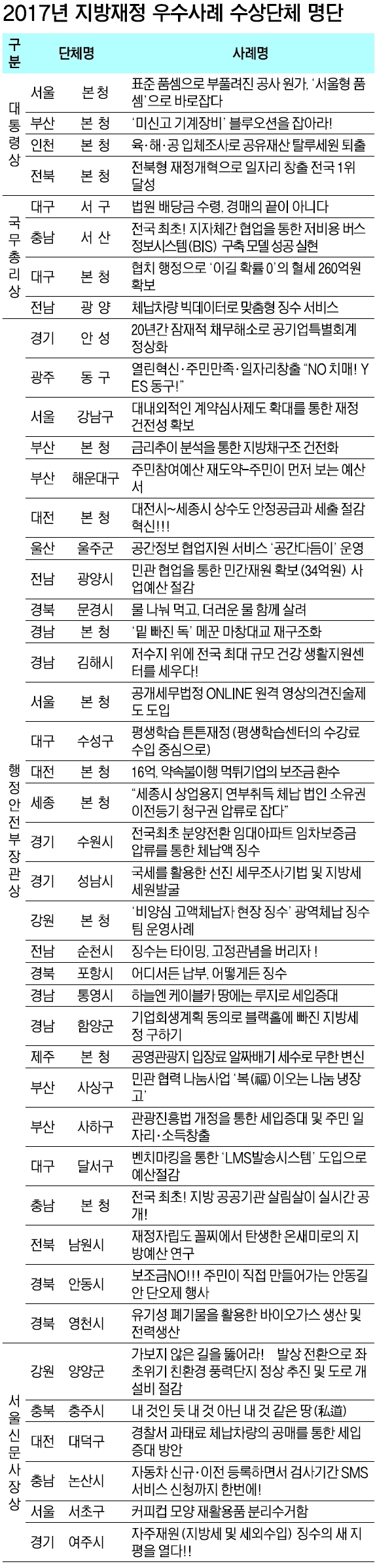 대구 서구와 충남 서산시 등 4개 지자체가 우수상인 국무총리상을, 경기 안성시와 광주 동구 등 30곳이 장려상인 행안부장관상을 차지했다. 특별상인 서울신문사장상은 강원 양양군과 충북 충주시, 대전 대덕구, 충남 논산시, 서울 서초구, 경기 여주시에 돌아갔다. 지자체가 세출을 줄이고 숨은 세원을 발굴한 사례를 공유하기 위한 이 대회는 올해로 10회째다.
