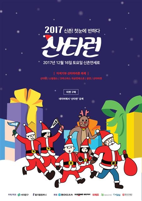 ‘산타런’ 참가비의 10%는 구세군을 통해 어려운 아동의 수술비로 기부된다. 캐나다, 미국, 영국 등에서도 크리스마스 시즌에 진행되는 행사다. 참가 신청은 네이버 예약에서 2017 산타런을 검색하면 할 수 있다. 이날 연세로에는 오후 4시 30분, 7시, 8시부터 각 30분 동안 인공 눈을 뿌려 축제 분위기를 북돋울 예정이다.