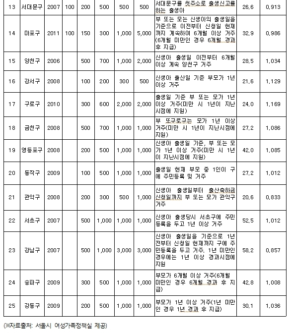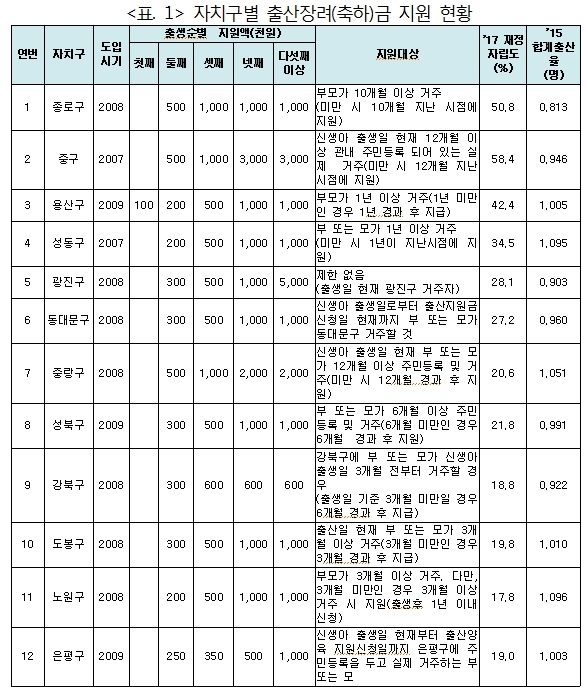 현재 서울시 각 자치구는 출산장려(축하)금을 자치구별로 지원하고 있지만 서울시에서는 아직도 직접적인 지원정책을 펼치고 있지는 않다. 자치구 별로 지급하는 출산장려금 또한 지역 재정 상황에 따라 수십만 원씩 차이가 나는 데다 아예 지원하지 않는 곳도 있어 문제가 많다는 지적을 받고 있는 실정이다.