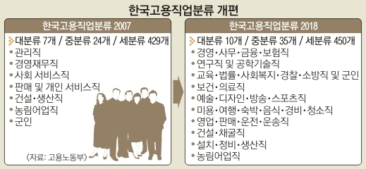 2007년 대분류 7개, 중분류 24개, 소분류 139개, 세분류 429개에서 11년 동안 유지됐던 직업분류는 대분류 10개, 중분류 35개, 소분류 136개, 세분류 450개로 개편된다. 4차 산업혁명 등 정보기술(IT) 발전에 따른 관련 직업의 증가로 인해 ‘연구직 및 공학기술직’이 대분류에 신설되고, 고령화에 따라 수요가 늘어나는 ‘보건·의료직’은 중분류에서 대분류로 변경됐다.