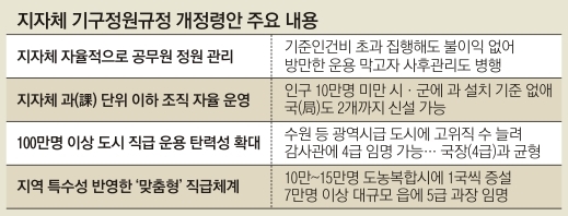 조직 운용과 직급 기준에도 융통성을 높인다. 인구 10만명 미만 시·군(과천 등 78곳)에 대해 과(課) 설치 상한 기준을 없애 모든 지자체가 과 단위 이하 조직을 자유롭게 신설하고 국(局)도 2개까지 설치할 수 있게 했다. 지금까지 해당 지자체는 부단체장이 9~18개 과를 직접 관할해야 해 통솔 범위가 지나치게 넓다는 비판이 많았다. 행안부 측은 “장기적으로 각 지자체가 실(室)·국(局) 수도 스스로 정할 수 있는 방안을 검토할 것”이라고 덧붙였다.