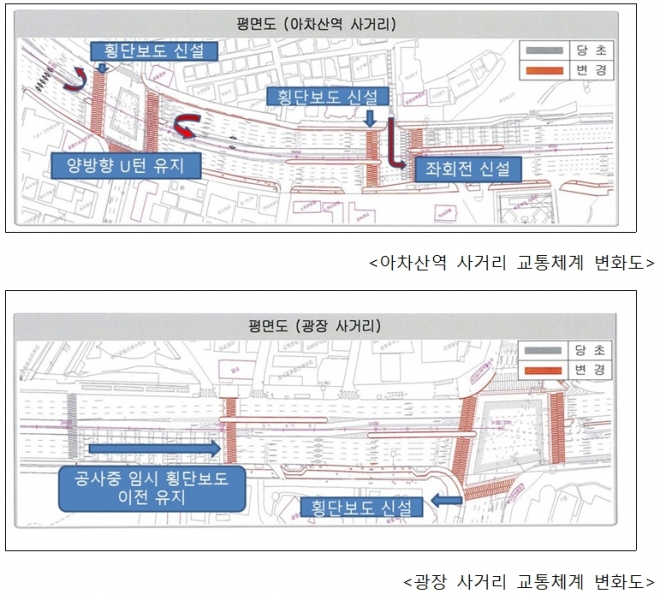 그동안 이 공사를 위한 사업비 예산확보와 조속한 완공을 위해 심혈을 기울여 온 문종철 의원(더불어 민주당, 광진2)은 “공사가 진행되면서 주민들의 요구를 반영하여 교통신호 체계 개편에 앞장섰다” 며 “△아차산역 사거리 북측방면(모리참치↔빛나는 바다)에 횡단보도 신설 △아차산역 사거리에 남북방향 모두 U턴 신호 유지 △천호대로 137길에서 천호대로 방향으로 좌회전 신호 설치 △천호대로 137길이 천호대로가 연결되는 교차로(장위동 유성집↔한국관광용품센터)에 횡단보도 신설 △광장사거리 서측방면(광나루역 3번 출구↔4번 출구) 횡단보도 신설 △광장사거리 북측방면 공사로 인한 임시 횡단보도를 광나루역 방향으로 약 100m이전하여 유지하는 것으로 주민들의 요구를 최대한 반영했다” 밝혔다.