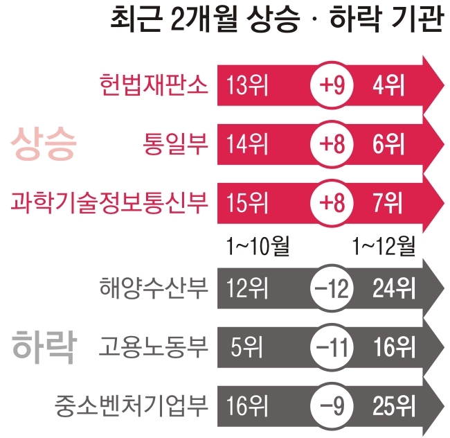 반면 헌법재판소는 13위에서 4위로 9계단 상승했다. 지난 한 해를 되돌아보는 기사에서 박근혜 전 대통령에 대한 탄핵이 다량 언급되면서 순위가 대폭 오를 수 있었던 것으로 분석된다. 통일부는 14위에서 6위로 8계단 뛰어올랐다. 판문점을 통해 귀순한 북한군 병사의 치료비를 지원하고, 대북 문제에서 유연한 대처 능력을 보인 것이 긍정적인 보도에 영향을 미친 것으로 보인다.
