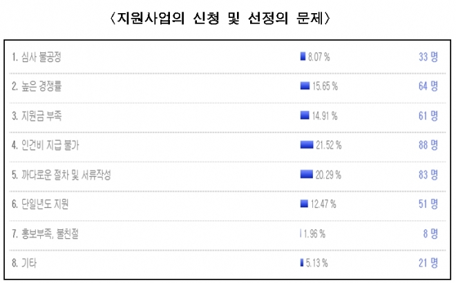 이번 연구보고서에 의하면 관리절차에서는 사업영역의 협소성, 서류 심사방식 문제, 공익사업선정위원의 비전문성, 사업선정에서 대형단체에 대한 이점, 단년간 지원제도의 한계 등과 같은 문제점이 발견됐고, 설문조사에서는 선정 단체의 활동범위가 세계 및 전국 수준이 대부분을 차지하고, 인건비 지급 불가에 대한 불만이 많으며, 공익사업선정위원과 컨설팅 전문가의 전문성 부족과 같은 문제가 제기됐다.