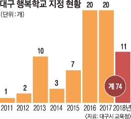 이에 따라 대구시교육청은 행복학교 선정 범위를 폐교 위기에서 교육환경이 열악한 소규모 학교로 확대했다. 지난해까지 행복학교는 63개교(초등학교 35개교, 중학교 28개교)이고 올해도 11개교가 더 지정돼 모두 74개교에 이른다. 올해 지정된 초등학교는 지묘초, 팔달초, 서평초, 학산초 등 4개교, 중학교는 신기중, 팔달중, 경상중, 월배중, 가창중, 북동중, 울안중 등 7개교다.