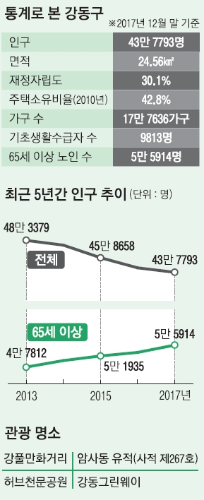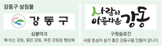 강동구는 서울 내 대표적인 생태도시다. 전체 면적의 44.3%가 녹지다. 강동구를 감싸는 그린웨이는 ‘걷기 좋은 코스’로 국제 인증을 받았다. 구는 이러한 환경적 특성을 살려 도시농업 열풍을 주도하고, 경제·환경·사회 모든 면에서 지속 가능한 정책을 추진 중이다. 서울의 한강 남동쪽에 있고, 지하철 5·8·9호선 연장으로 서울 동남권의 교통 중심지로 떠오르고 있다. 현재 인구는 43만여명이지만 재건축이 완료되는 2022년 54만명에 육박할 것으로 보인다. 과거보다는 현재가, 현재보다는 미래가 더욱 기대되는 도시다.