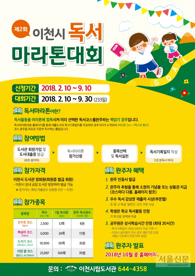 시에 따르면 이번 대회는 10일부터 9월 30일까지 233일간 진행되며 10일부터 이천시립도서관 홈페이지(http://www.icheonlib.go.kr) 또는 이천시 독서마라톤 홈페이지(http://marathon.icheonlib.go.kr)를 통해 신청 가능하다.