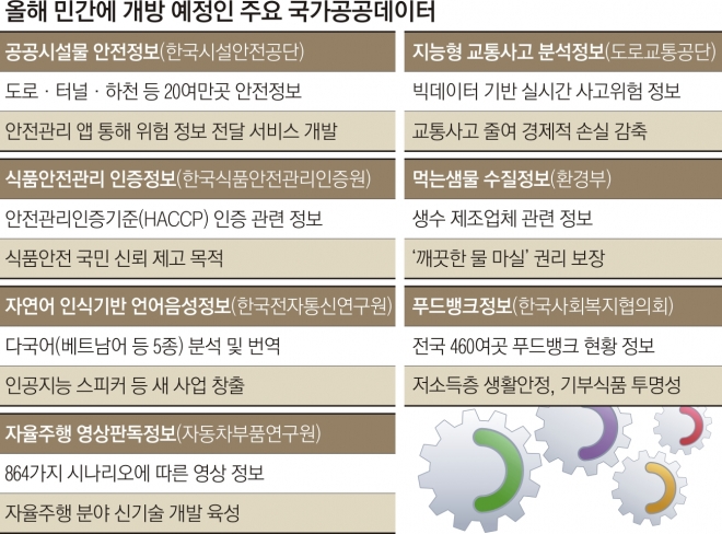 자동차부품연구원의 자율주행 영상판독 정보의 경우 날씨와 도로유형 등을 고려한 864가지 시나리오로 세분화된 영상데이터를 갖고 있다. 자율주행 분야 업체에 제공할 경우 신기술 개발을 앞당길 수 있게 도움을 줄 것으로 기대된다. 한국시설안전공단의 공공시설물 안전정보 역시 도로와 터널, 하천 등 20여만곳 공공시설물 안전점검 결과와 안전등급정보 데이터 등 공공시설물안전정보로 이뤄져 있다. 안전관리 분야 신규 민간서비스를 창출하고 재난·재해로부터 국민 안전 확보에 기여할 것으로 보인다.
