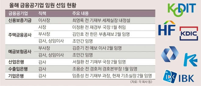 KDB산업은행과 IBK기업은행은 지난달 말 감사를 임명했다. 서철환 산은 감사는 기획재정부 국장, 임종성 기업은행 감사는 기획재정부 과장, 헌법재판소 기획조정실장 등을 지냈다. 수출입은행은 지난 1월 조용순 전 대통령비서실 경호처 경호본부장을 감사로 선임했다.