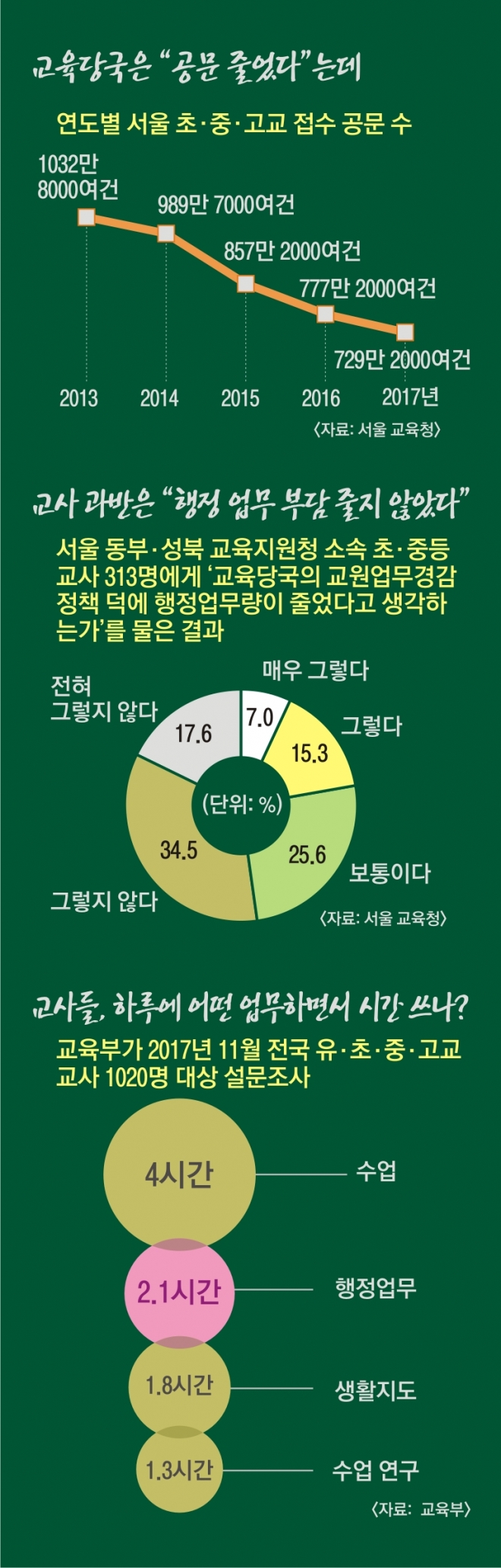 현장 교사들은 최근 공문이 줄었다는 교육당국의 주장에 대해서도 “반은 맞고 반은 틀린 얘기”라고 말한다.