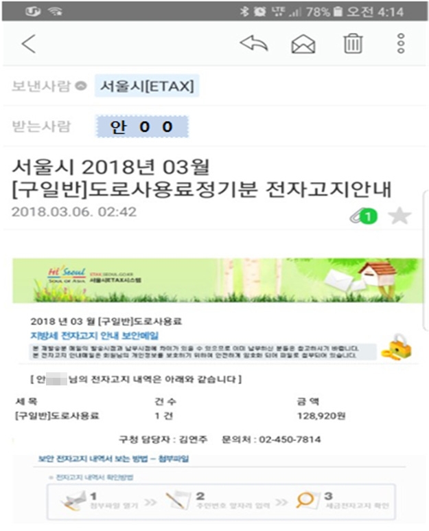 실제로 우형찬 의원에게도 다른 사람(안 0 0)에게 발송되어야 하는 ‘도로사용료 정기분 128,920원에 대한 전자고지서’가 발송됐다.