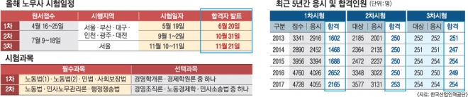 1차 시험은 오지선다 객관식이고 5과목이다. 노동법(1)·노동법(2)·민법·사회보장법까지가 필수과목이고 나머지 하나는 선택과목 2개(경제학원론·경영학개론) 중에서 선택한다. 각 100점씩이며 각 과목 40점 이상, 전 과목 평균 60점 이상이 돼야 합격한다. 1차 시험에서 영어는 공인 영어성적으로 대체된다. 토익(TOEIC) 700점 이상, 텝스(TEPS) 625점 이상 등이다. 2차 시험은 논술형으로 4과목이다. 노동법·인사노무관리론·행정쟁송법이 필수과목이며 나머지 하나는 선택과목 3개(경영조직론·노동경제학·민사소송법) 중 고른다. 노동법만 배점이 150점이고 나머지 세 과목은 각 100점씩이다. 노동법은 4문제가 나오고 나머지는 3문제씩 나온다. 1차 시험을 통과하면 그해와 다음 해 2번의 2차 시험 응시 기회를 준다. 3차 시험은 면접이다. 최근 3년간 3차에서 합격하지 않은 응시생은 단 1명에 불과했다.