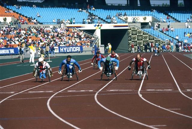 평창동계패럴림픽은 9일 개막해 18일 막을 내렸다. 총 49개국이 참가해 승리보다 값진 땀을 쏟아냈다, 특히 북한과 조지아, 타지키스탄 등 3개국은 처음 참가했다. 우리나라의 패럴림픽 개최는 1998년 서울하계패럴림픽 이후 두 번째다. 사진은 서울하계패럴림픽 당시 육상 남자 휠체어 400m 부문의 경기 모습.