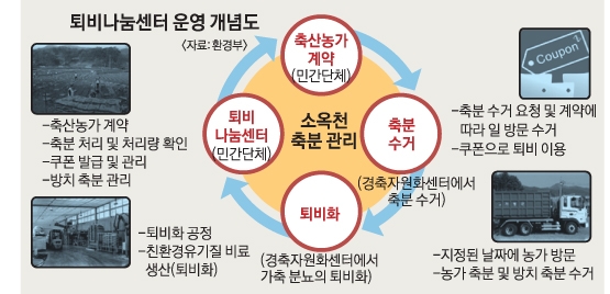 주민, 시민단체, 전문가 등으로 꾸려진 ‘소옥천 유역 정밀조사단’이 지난해 10월부터 지난 1월까지 조사한 결과 소옥천 유역에서 방치된 축분이 오염 부하의 42%(총인 기준)를 차지하는 것으로 나타났다. 이 지역 축산농가 입장에선 퇴비로 쓸 분량 이외의 가축 분뇨를 마땅히 처리하기 어려웠기 때문이다. 옥천군과 시민단체에서 운영하는 퇴비나눔센터는 이 문제를 해결하고자 모든 농가를 방문해 가축 분뇨를 모두 수거한다. 이를 퇴비로 만들어 가축 분뇨를 제공한 농가에 제공량에 맞게 퇴비 쿠폰을 지급한다.