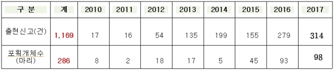 최근 서울시가 제출한 자료에 의하면 2010년 출현신고(건)이 17건 이었으나 2017년에 314건으로 증가하여 18.5배가 증가했다. 사실 자료에 의한 숫자는 현실과는 많은 차이가 있을 수 있다. 특히 개체수를 정확히 파악하지 못하고 있어 앞으로 출현횟수는 꾸준히 늘어만 가게 될 것이다. 지난 1월에 서울시의회에서 김광수 의원 주관으로 ‘증가하는 멧돼지 도심출몰, 대책은 무엇인가’라는 주제로 토론회를 가졌다.