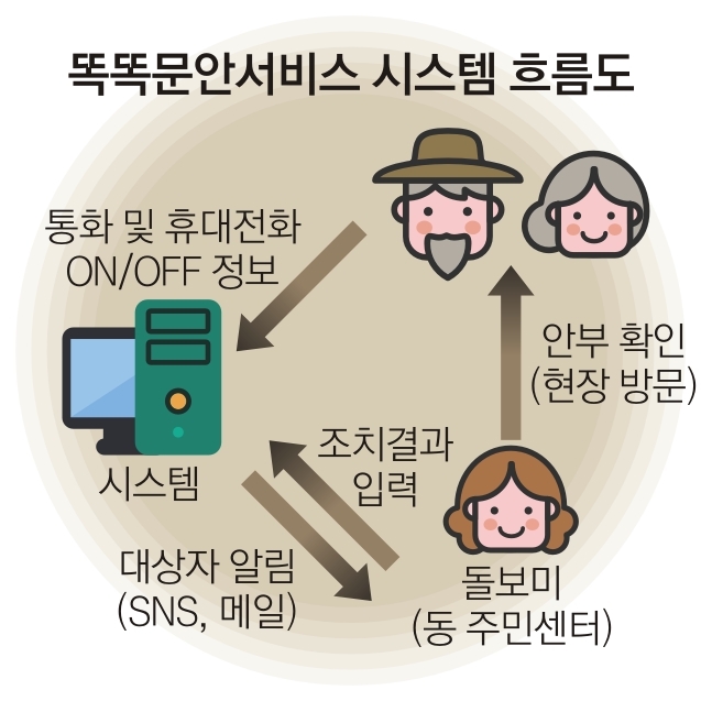 ‘똑똑문안서비스’는 일정 기간 독거 주민의 휴대전화 통화기록이나 휴대전화가 꺼져 있을 경우, 구청 내부 전산망으로 알림 정보를 보내는 서비스다. 가령 설정 기간을 3일로 지정한 독거 주민이 3일 동안 통화를 한 번도 하지 않거나 휴대전화가 꺼진 상태로 지내면 동주민센터 공무원에게 안부를 확인하라는 문자메시지와 이메일이 자동 발송되는 시스템이다. 알림을 받은 담당 공무원은 독거 주민에게 연락을 시도하고 통화가 안 될 경우 직접 방문해 안부를 확인한다.