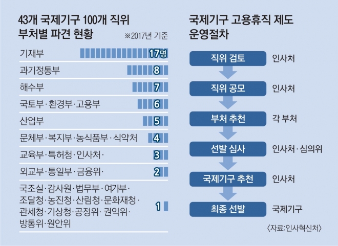 국제기구 파견 직위는 2015년 이후 대폭 늘어났다. 2009~2012년 4년간 60개를 유지하다가 2016년 85개로 크게 늘었다. 지난해는 100개까지 증가했는데 인사처가 외국 정부보다 파견 인원이 적다는 근거를 내세웠다. 당시 인사처가 내놓은 ‘고용휴직 확대 방안’에 따르면 유엔과 산하기구 35개에서 근무하는 우리나라 공무원과 민간인이 285명이었던 것에 견줘 미국(2094명), 일본(792명), 호주(571명), 중국(559명)은 근무자가 상대적으로 많았다. 지난해 말 우리나라는 43개 국제기구에 모두 100개의 직위를 운영하고 있다. 올해 5개 직위를 더 발굴해 105개까지 확대됐다.