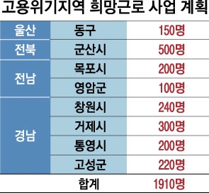 행정안전부는 고용위기지역의 실직자와 가족의 생계안정을 위해 이런 내용의 ‘희망근로 지원사업’을 추진한다고 7일 밝혔다. 기업의 대규모 도산과 구조조정으로 고용안정에 심각한 문제가 생긴 지역을 고용위기지역으로 지정한다. 지난 4~5월에 울산 동구와 전북 군산, 전남 목포·영암, 경남 창원·진해·통영·거제·고성이 지정됐다. 예산은 국비·지방비 합쳐 150억여원을 투입한다.