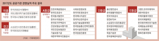 ‘미흡’(D) 등급은 울산항만공사, 한국광물자원공사, 한국석유공사, 한전KPS 등 9곳이다. 이 중 울산항만공사와 한국석유공사는 2년 연속 미흡 판정을 받았다. 평가 대상 123곳 중 13.8%인 17곳이 낙제점을 받은 셈이다.