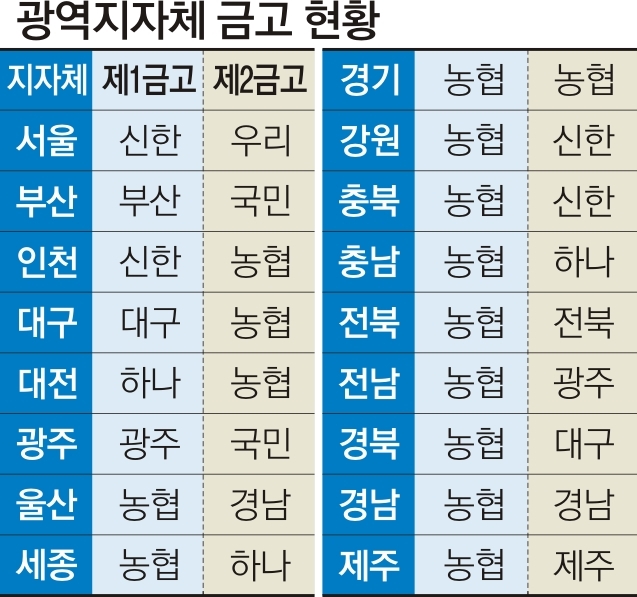 광역시와 도시지역 지자체는 대부분 시중은행이 금고를 차지하지만 농촌지역은 NH농협은행이 제1금고, 지방은행이 제2금고로 선정되는 경우가 많다. 지점이 많아 이용 편의성과 지역사회 기여도에서 높은 점수를 받기 때문이다.