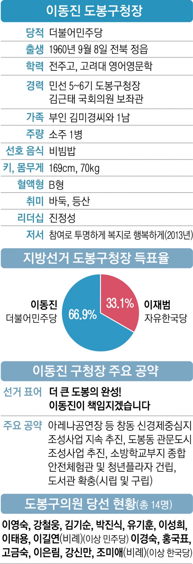 이동진 서울 도봉구청장은 2010년 민선 5기에 당선된 이후 6기 재선에 이어 지난달 13일 제7회 전국동시지방선거에서 다시 한번 도봉구민의 선택을 받아 3선 구청장이 됐다.