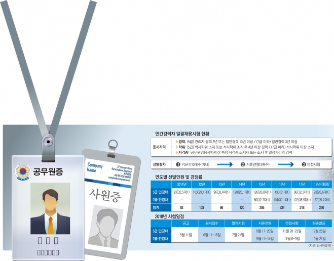 오는 21일 ‘2018년도 국가공무원 5·7급 민간경력자 일괄채용’(민경채) 필기 시험이 치러진다. 민간의 전문성을 공직에 유치하겠다는 취지로 만들어진 민경채는 짧게는 3년에서 길게는 10년 이상의 경력, 혹은 최소 석사에서 박사학위가 있어야만 응시할 수 있다. 지난 10일 취업포털 잡코리아 조사 결과 취업준비생과 직장인 10명 중 3명(32.9%)은 공무원시험을 준비하고 있거나 준비한 경험이 있었다. 이들 중 13.9%는 민경채를 준비하고 있다고 답했다. 민간에서 전문성을 기르고 있을 예비 지원자들을 위해 민경채에 대한 정보와 합격자들의 경험을 들어봤다.