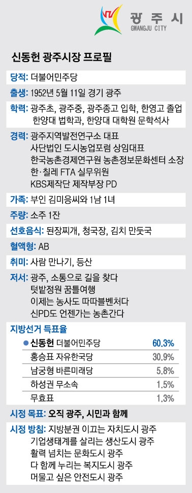 독립운동가이자 한국 민주주의 발전에 헌신한 해공 신익희 선생 후손인 신동헌(66) 광주시장은 경기 광주시 쌍령동 출생으로 광주초, 광주중, 광주종고(현 광주중앙고)와 한영고를 거쳐 한양대 법학과와 언론정보대학원 석사과정을 졸업했다. 광주농고에 수석으로 입학해 도비 장학금으로 공부했고 당시 광주 출신으로는 드물게 언론인의 길을 걸었다. 중앙일보, 동양방송을 거쳐 KBS PD로 20여년간 활동했다. ‘농어촌 지금’, ‘맛따라 길따라’, ‘문화가 산책’ 등을 연출했다.