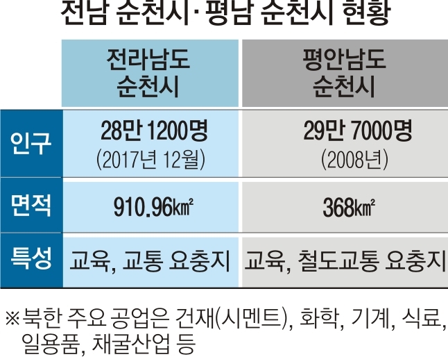 허석(55) 순천시장은 5일 “생태관광 교류와 함께 평안남도 순천시와 교류협력 사업도 추진해 나갈 계획”이라며 이렇게 말했다. 또 “교통요지, 교육도시 등 공통점이 많기 때문에 남북 화해 분위기에 맞춰 교류를 추진할 것”이라고 덧붙였다. 평남 순천시는 인구 29만여명으로 양잠업과 함께 풍부한 석회석을 원료로 한 시멘트 산업을 자랑하는 도시다.