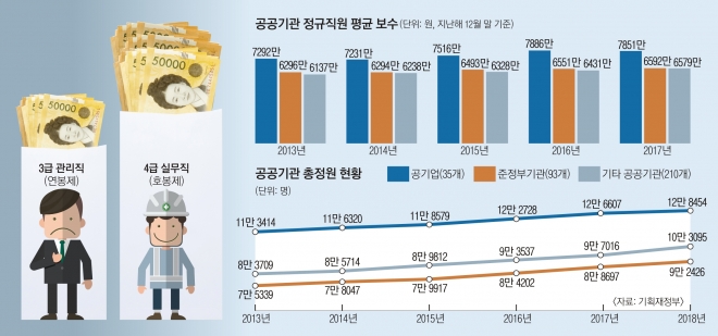 전문가들은 현재 공공기관 임금체계가 세대 간 형평성과 직무에 따른 형평성 양쪽에서 문제를 안고 있다고 지적한다. 호봉제는 근속 연수에 비례해 임금이 늘어나다 보니 직급 간 임금 역전, 인건비 부담으로 인한 신규 고용 여력 약화 등을 초래한다. 이명박·박근혜 정부는 대안으로 연봉제를 강조했지만 실제로는 기본 연봉 설정 기준이 불합리해 상하위 직급 간 임금 역전을 초래하는 문제는 여전했다. 게다가 외국인 전용 카지노를 운영하는 그랜드코리아레저의 딜러와 마케팅직처럼 직무가 다른데도 같은 임금 체계를 적용하는 난맥상도 나타났다.