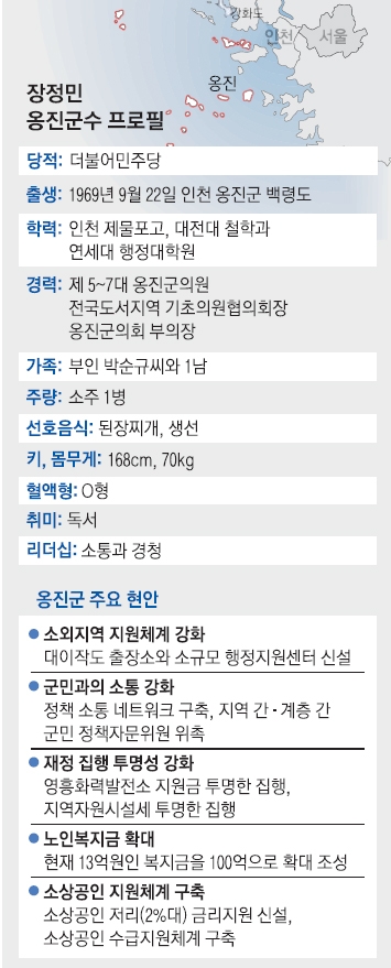 장정민 인천 옹진군수는 지방선거에서 예상을 뒤엎고 당선됐다. 옹진군에서 더불어민주당 후보가 당선된 것은 2002년 지방선거 당시 새천년민주당 조건호 군수가 당선된 이후 16년 만이다. 옹진군은 백령도 앞바다에서 천안함이 폭침당하고 연평도가 피격되는 등 북한의 상습적인 도발에 시달려 보수 성향이 강한 곳이다. 주민들은 남북 화해 분위기가 전국을 물들인 노무현 정부 때도 보수 후보를 당선시켰다. 심지어 민선 5기 때는 민주당이 옹진군을 ‘당선 불가’ 지역으로 분류해 아예 후보를 내지 않아 조윤길 군수가 무투표 당선되기도 했다. 6기 때도 민주당은 후보를 내지 않아 무소속 후보 1명만이 조 군수와 대결을 펼쳤지만 참패했다.