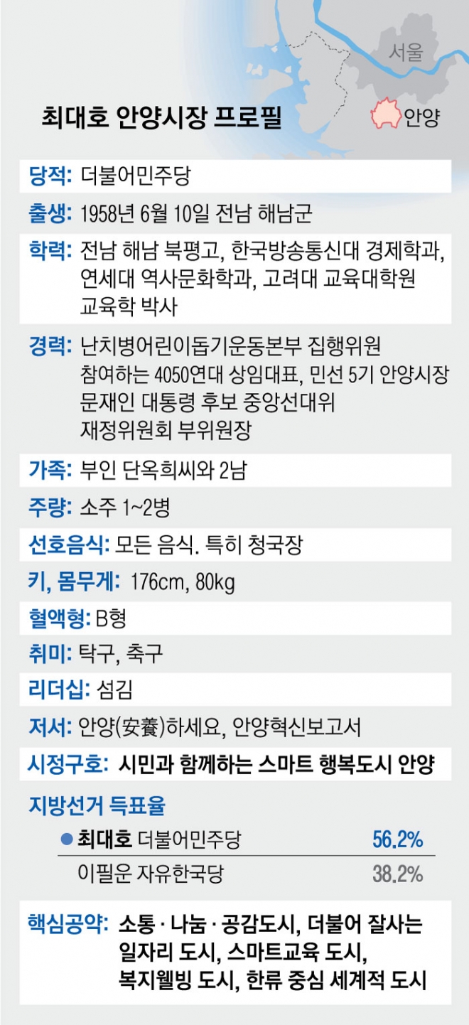 -지난달 인구 50만명 이상 대도시 시장으로 구성된 전국대도시시장협의회 민선 7기 제1차 정기회의에서 제16대 회장으로 선출됐다. 협의회는 안양을 비롯해 수원, 성남, 고양, 창원 등 15개 지자체로 이뤄졌는데, 인구는 1200여만명으로 우리나라 인구의 약 23.2%를 차지한다. 지방자치와 분권 시대를 맞아 회장으로서 책임감이 크다. 대도시 간 협력과 상생 발전을 모색하고 지방분권을 위해 불합리한 제도와 구조적인 문제점을 개선할 수 있도록 중앙 부처에 적극 건의하고 협의하겠다.