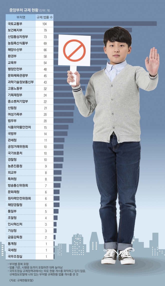 28일 정부가 제공하는 ‘규제정보포털’에 따르면 중앙부처 소관 규제법령은 법률 기준으로 800~900건 정도다. 법에 따라 소관부처가 겹치기도 하지만 법률 아래 시행령까지 포함하면 개수는 더 늘어난다. 국무조정실 측은 “중앙부처 규제의 정확한 양적 현황을 관리하지 않는다”고 밝혔다. 다만 지역별로 조례·규칙으로 정한 규제는 3만 7128개다. 행정안전부가 지자체와 합동으로 조사한 결과 지역 기업이 신제품이나 서비스를 개발해도 규제 때문에 테스트나 상용화를 하지 못하는 건수는 140여건이나 됐다.