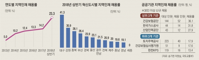 지역인재 채용이란 공공기관이 이전한 지역에 소재하는 지방대학 또는 고등학교를 졸업한 사람을 뽑는 것을 뜻한다. 혁신도시법에는 합격자 중 지역인재가 목표 비율에 미달하는 경우 선발예정인원을 초과해 추가 합격시켜야 한다는 조항까지 있을 정도로 정부는 지역인재 채용 정책에 드라이브를 강하게 걸고 있다. 올해 지역인재 채용 비율을 18%로 정한 정부는 매년 3% 포인트씩 올려 2022년에는 30%를 달성하겠다는 목표다.