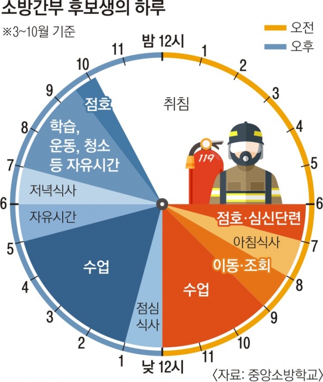 소방간부 후보생 제도는 1977년 도입됐다. 2년에 한 번 뽑다가 인력 수요가 늘어 2010년부턴 1년에 한 기수씩 뽑기 시작했다. 한 기수당 정원은 30명. 올해는 901명이 응시해 약 30대1의 경쟁률을 보였다. 이번 후보생들은 지난 3월부터 중앙소방학교에서 훈련을 받고 있다. 교육 기간은 1년이다. 후보생 전원은 기숙사에서 동고동락하며 다양한 일정을 소화한다. 일선 현장에서 지휘관으로 활약하거나 소방정책 지원 업무를 맡을 후보생들은 교육이 끝나면 전국에 있는 소방관서로 배치된다. 1년 정도 현장에서 일하며 실무 경험을 쌓는다.