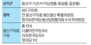 김 의장은 서울시 25개 자치구의회 가운데 유일하게 한국당 당적을 가진 의장이기도 하다. 김 의장은 책임감을 무겁게 느낀다”면서 “한국당이 잘못한 게 많기에 국민 사랑을 받지 못하고 있다. 국민 마음을 돌릴 수 있게 열심히 뛰고 성실하게 의정 활동에 임하겠다”고 각오를 밝혔다. 용산구의회는 한국당 의원 6명, 민주당 의원 6명, 정의당 의원 1명으로 구성돼 절묘하게 균형을 이뤘다.