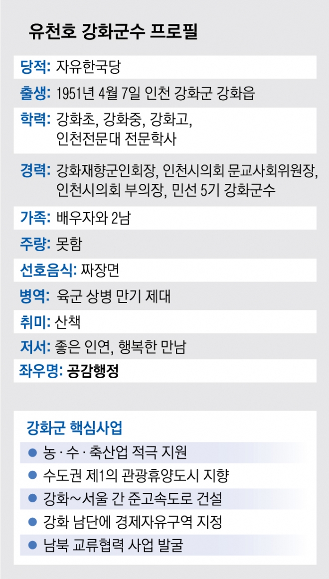 -첫째 군민이 주인인 ‘군민 제일주의’를 선언하고, 각종 민원을 군민 입장에서 바라보고 최우선으로 해결하도록 노력하겠다. 무엇보다 군민이 부르기 전에 먼저 달려가는 군수가 되겠다. 열린 군수실을 만들어 항상 군민과의 소통을 최우선으로 여길 것이며, 군민생활에 불편을 주는 불필요한 규제와 제도는 과감히 개혁해 나가겠다. 둘째 보이지 않는 곳을 밝게 만들겠다. 사랑의 효 도시락 제공 및 공동 나눔쉼터 조성 등 어르신이 대우받는 사회를 만들어 나가겠다. 또 특성화 고등학교 유치와 제2의 강화장학관 건립 등 교육환경을 개선하고, 영유아 보육시설 지원 등 여성과 아이가 행복한 강화를 만들어 나가겠다. 셋째 도심 속 근린공원 조성 등 쾌적한 생활환경을 조성하고, 강화 5일장을 관광 브랜드화하는 등 관광산업 육성 및 일자리 확충을 통해 지역경제를 활성화하겠다. 공무원이 기를 살려 열심히 일할 수 있는 환경을 만들어 나가겠다.