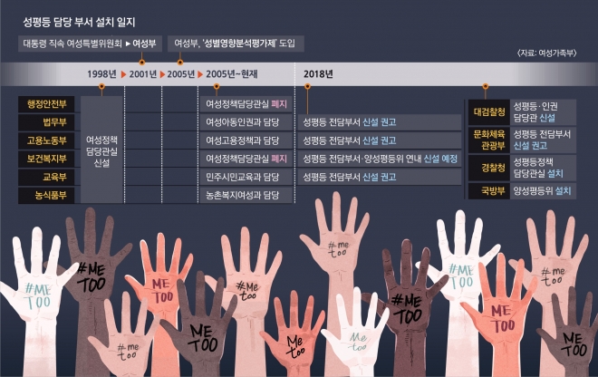 2일 여성가족부 등에 따르면 2016년 서울 강남역 살인 사건과 올 초 미투(#MeToo·나도 피해자다) 운동 이후 여성에 대한 성희롱·성폭력 근절과 여성 권익 신장을 요구하는 목소리가 커지자 문재인 대통령은 지난 7월 국무회의에서 “성평등의 문제를 여가부의 의무로 여기지 말고 각 부처 행정 영역에서 고유 업무로 인식해 달라”며 중앙 부처 내 성평등 담당 부서 설치를 북돋았다.