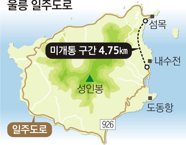 울릉도 유일의 간선도로인 일주도로는 1962년 박정희 국가재건최고회의 의장이 울릉도 순시 이후 울릉도 종합개발계획의 하나로 지적한 뒤 이듬해 3월 개설을 확정했다. 1976년 첫 삽을 뜬 뒤 2001년까지 지방비 790억원을 들여 39.8㎞ 구간을 개설했다. 나머지는 해안 절벽으로 이뤄진 난공사 구간인 데다 공사비 확보 문제로 10년여 동안 미개통 구간으로 남아 있었다. 결국 경북도와 울릉군은 수차례 중앙부처를 방문한 끝에 2008년 11월 섬 일주도로를 국가지원지방도로 승격시켜 사업비 1366억원을 국고에서 확보해 2012년 초 공사에 들어갔다.