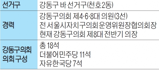 제8대 강동구의회는 민주당 의원 11명, 자유한국당 의원 7명으로 짜였다. 특히 전체 의원(18명)의 3분의2인 12명이 초선 의원으로 채워졌다는 점이 눈길을 끈다.