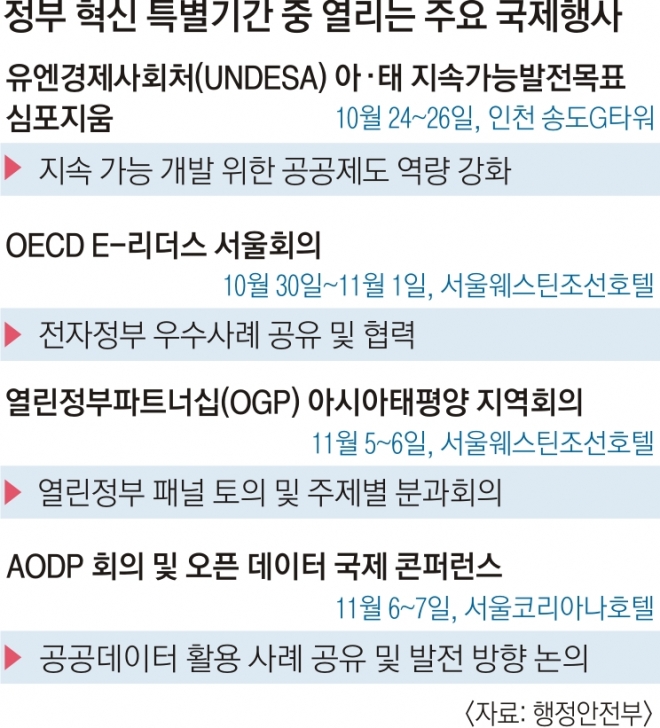 24~26일에는 인천 송도G타워에서 ‘2018 아시아·태평양 지속 가능 발전 목표 달성을 위한 심포지엄’이 열린다. 빈부 격차와 환경 오염, 기후변화 등 인류가 맞닥뜨린 ‘개발의 부작용’에 대한 해법을 모색한다. 30일부터 다음달 1일까지 서울웨스틴조선호텔서 진행되는 ‘OECD E-리더스 2018 서울회의’는 OECD 국가 간 전자정부 협력을 통해 우리나라 전자정부의 글로벌 리더십을 강화하기 위한 행사다. OECD 36개 회원국 최고정보화책임관(CIO)과 전자정부 담당자, 비회원국 전자정부 담당자 등 100여명이 참석해 디지털 정부 발전을 위한 협력 방안을 찾는다. 다음달 6~7일에는 서울코리아나호텔에서 ‘아시아오픈데이터파트너십(AODP) 회의·오픈데이터 국제 콘퍼런스’가 개최된다. 주요 국가 간 공공데이터 활용을 통해 경제적·사회적 가치 창출 사례를 발표하고 향후 발전 방향을 논의한다. 한국과 일본, 대만 등 아시아 11개국이 참여한다.