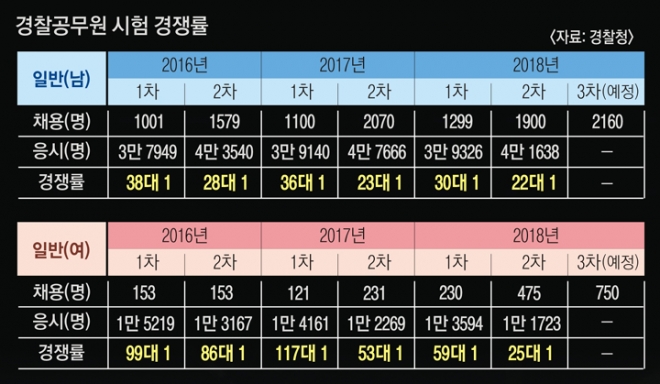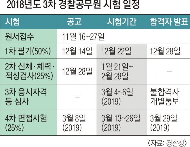 순경직은 1차 필기시험(50%), 2차 신체·체력·적성검사(25%), 3차 응시자격 등 심사, 4차 면접시험(25%)으로 진행된다. 필기시험 땐 한국사와 영어가 필수이며 형법과 형사소송법, 경찰학개론, 국어, 수학, 사회, 과학 7과목 중 3과목을 선택해야 한다. 대부분의 경찰직 수험생들은 형법과 형사소송법, 경찰학개론을 선택한다. 실무에 꼭 필요한 지식이어서 합격 후 경찰학교에서도 세 과목에 대한 심화학습이 이뤄진다. 다른 직군 9급 공채와 병행하는 수험생은 국어나 수학, 사회, 과학 과목을 선택하기도 한다. 고등학교에서 배우는 과목들이라 공부하기가 수월할 거라는 생각과 달리 오히려 지엽적이거나 난도가 높아 고득점을 받기 어렵다.