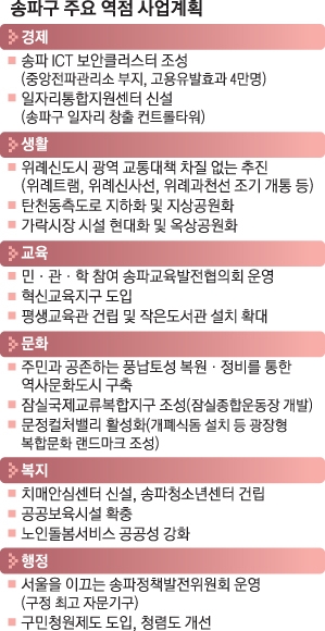 -서울시를 빼놓고 구정을 논할 수는 없다. 잠실종합운동장 MICE단지 조성, 가락시장 현대화 사업, 탄천동측도로 지하화, 성동구치소 이전 부지 개발, 탄천유수지 내 문화체육시설 건립 등 송파 현안 사업은 서울시의 행정적·재정적 협조가 필요하다.