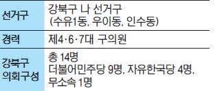 현재 강북구의회는 민주당 9명, 한국당 4명, 무소속 1명으로 돼 있다. 전례를 찾을 수 없는 ‘여대야소’다. 이런 구성은 이 의장에게도 낯설다. 이 의장은 “강북구 발전을 위해서는 자체세입을 늘리고, 국비와 시비를 더 확보하는 노력이 절실하다”면서 구의회도 적극 나설 것이라고 강조했다. 그는 “삼양동 거리 개발 문제를 비롯해 북한산 주변 고도제한 완화 등 현안이 산적해 있다”면서 “낡은 데다 공간도 협소한 구청을 신축하는 문제도 시급하다”고 지적했다.