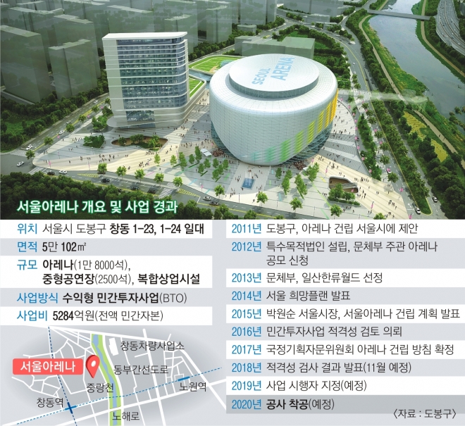 극적인 반전은 문재인 정부 출범이었다. 대선 공약을 거쳐 국정기획자문위원회가 아레나 건립을 포함해 창동·상계동을 동북아 신문화중심지로 조성하는 방안을 ‘국정운영 5개년 계획’에 포함시켰다. 올해 4월에는 서울아레나 사업부지인 창동운동장 체육시설이 1·7호선 도봉산역 인근 다락원체육공원으로 이전을 완료했다. 도봉구는 6월부터 창동운동장 부지에 남은 체육시설을 철거하는 공사도 착수했다.