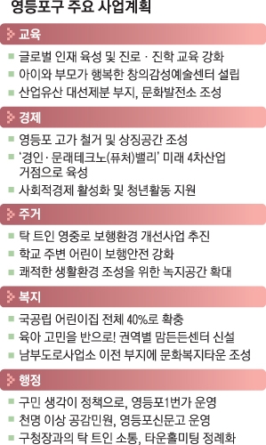 -그렇다. 10월 15일 영등포구의 분야별 목표로 ‘꿈이 실현되는 교육도시’, ‘조화로운 성장 경제도시’, ‘쾌적한 주거 안심도시’, ‘더불어 잘사는 복지도시’, ‘소통과 협치의 민주도시’를 제시했다. 교육, 주거환경, 4차산업, 일자리, 문화, 사회적경제 등 중요 정책에 대한 내용이 담겨 있다. 우선 주거환경이 개선돼야 아이들 키우기 좋은 곳이 되고 주변 상권도 살아난다. 지금의 영등포는 회색도시의 이미지를 갖고 있다. 이제 변화를 시작할 때라고 생각한다.
