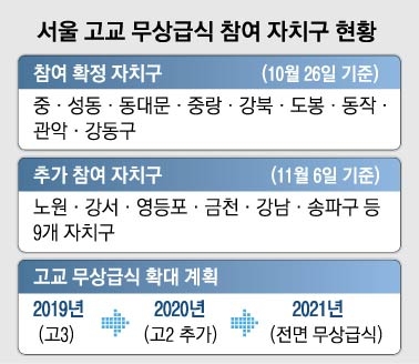 고교무상급식은 서울교육청이 50%, 서울시가 30%, 자치구가 20%의 예산을 부담한다. 서울시와 서울교육청은 참여율을 최대한 끌어올려 가능한 한 모든 자치구가 참여할 수 있도록 한다는 방침이다. 서울교육청 관계자는 “아직 추가로 참여하겠다는 자치구의 최종 명단이 확정되지 않았지만 참여 여부만 결정되면 교육청 차원에서 할 수 있는 지원은 최대한 한다는 입장”이라고 말했다. 서울시와 서울교육청은 우선 내년부터 참여를 결정한 자치구 내 고3 학생들부터 무상급식을 시작해 2020년에는 고2, 2021년에는 고교 전 학년으로 무상급식을 확대한다는 목표다.