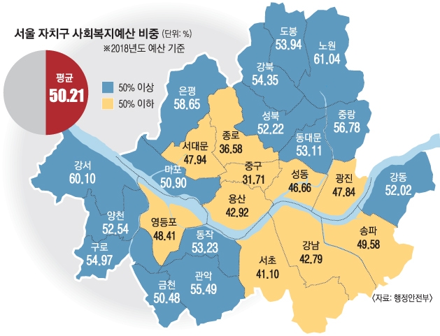 7일 ‘서울신문’이 행정안전부 자료를 분석한 결과 사회복지예산 평균은 50.2%(2018년도 기준)로 나타났다. 2013년만 해도 사회복지예산 비중이 50%가 넘는 자치구가 7곳에 불과했던 것과 비교하면 복지예산 증가세가 확연하다.