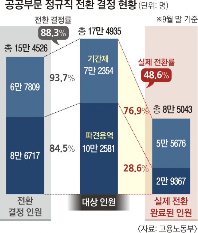 8일 고용노동부에 따르면 지난 9월 말 기준 전체 대상 인원의 48.6%인 8만 5043명이 실제로 정규직으로 전환됐다. 파견·용역 등 간접고용 노동자들은 대상 인원의 28.6%인 2만 9367명만 전환됐다. 자회사, 직접고용 등 전환 방식을 놓고 갈등을 빚으면서 겨우 전환 결정이 확정됐음에도 실제로 전환이 되지 않거나 아예 결정조차 이뤄지지 않은 공공기관이 많다는 의미다.