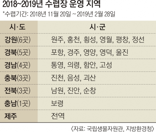 지역별로는 ▲강원도 6곳 ▲경북도 5곳 ▲경남도 4곳 ▲충북도 3곳 ▲전북도 3곳 ▲충남도 1곳 ▲제주시 1곳 등이다. 전국 수렵 면적은 모두 1만 2034㎢이며, 허용 인원은 8871명이다. 이번에 포획 가능한 조수는 멧돼지, 고라니, 수꿩, 까치 등 16종이다. 조수별로는 오리류가 44만 7915마리로 가장 많다. 참새 44만 3336마리, 까마귀류 19만 9981마리, 멧비둘기 7만 4933마리, 까치 3만 9845마리, 청솔모 1만 9700마리, 수꿩 1만 9527마리 등이다. 특히 엽사들에게 ‘월척’으로 통하는 멧돼지와 고라니는 각 3만 8736마리, 5만 3036마리다.