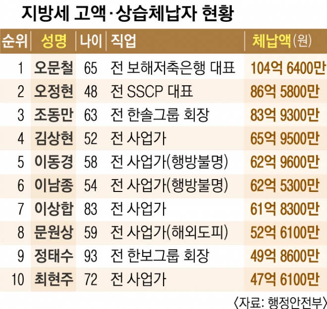 정태수(95·49억 8600만원) 전 한보그룹 회장도 고액 체납자 9위에 오르며 3년 연속 명단에 올랐다. 전두환(87) 전 대통령 역시 지방소득세 등 8억 8000만원을 내지 않아 명단 공개 대상이 됐다. 여기에 김우중(82) 전 대우그룹 회장이 새로 포함돼 눈길을 끌었다. 김 전 회장은 지방소득세 35억 1500만원을 체납했다. 김 전 회장은 차명주식 매각대금을 추징금(17조 9000억원)보다 세금을 내는 데 먼저 쓰겠다며 국세청과 소송을 벌이다 지난해 최종 패소해 올해 지방세 고액 체납자 명단에 등재됐다.